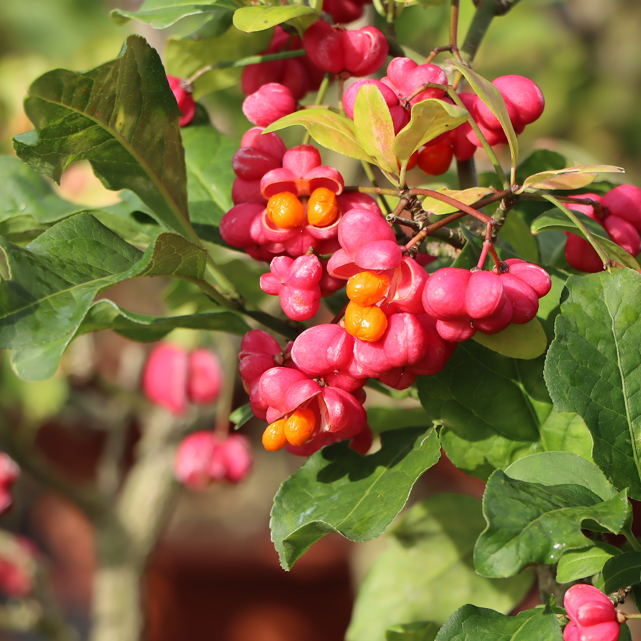 The european spindle is found naturally in Europe and as far as Asia Minor. In Germany it often grows in hedges, as field trees or on the edges of forests. The growth is mostly shrub-like and sometimes a small tree also develops. The plant is actually inconspicuous, but ultimately stands out due to its great fruits and the very beautiful autumn color. The fruits are pink to carmine-red, 4-lobed fruit capsules that burst open in winter and reveal the red core. The european spindle is frost hardy and very robust. It prefers moist, nutrient-rich soils and loves lime.