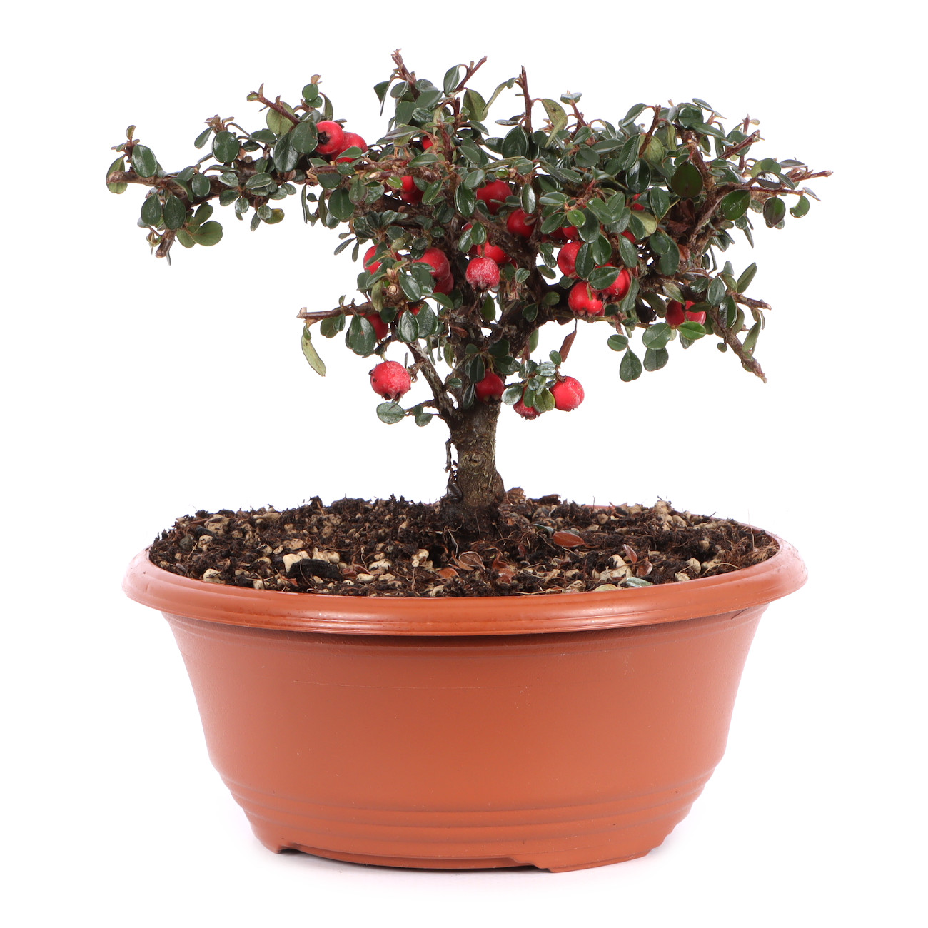 Die Zwergmispel ist wie für die Bonsaigestaltung geschaffen. Ihre Blätter, Blüten und Früchte sind klein, absolut schnittverträglich und treiben immer wieder willig aus. Sie blüht von Mai bis Juni mit kleinen weißen Blüten und bekommt anschließend ab September rote Beeren. Diese haften auch noch im Winter an der Pflanze. Sie ist für alle Gestaltungsformen geeignet, zumal sie das ganze Jahr gedrahtet und geschnitten werden können. Sie kann über viele Jahre hin sehr klein gehalten werden. Die Zwergmispel eignet sich auch als Unterbepflanzung für Wälder oder Landschaften (Saikei). Beim Drahten sollte darauf geachtet werden, dass die kleinen Blätter nicht mit eingedrahtet werden. Dies ist bei der Vielzahl an Blättern natürlich nicht ganz einfach. Die Zwergmispel stellt keine besonderen Standortansprüche, aber man sollte Extreme trotzdem vermeiden. Je heller der Standort ist, umso ausgeprägter ist die Blüten- und Fruchtbildung.
