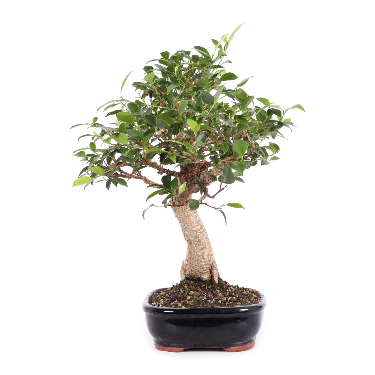 Die Sorte ‘Tiger Bark‘ hat im Vergleich zu der Art eine auffällige, tigerähnliche Rindenzeichnung. Diese weißen Kork- oder Lentizellen sowie die zahlreichen hellbraunen Luftwurzeln verleihen auch jungen Pflanzen schnell ein urwüchsiges Aussehen. Außerdem sind die Blätter dieser Ficus-Art klein und der Wuchs ist kompakt. Insgesamt hat diese Pflanze also sehr gute Eigenschaften als Bonsai.