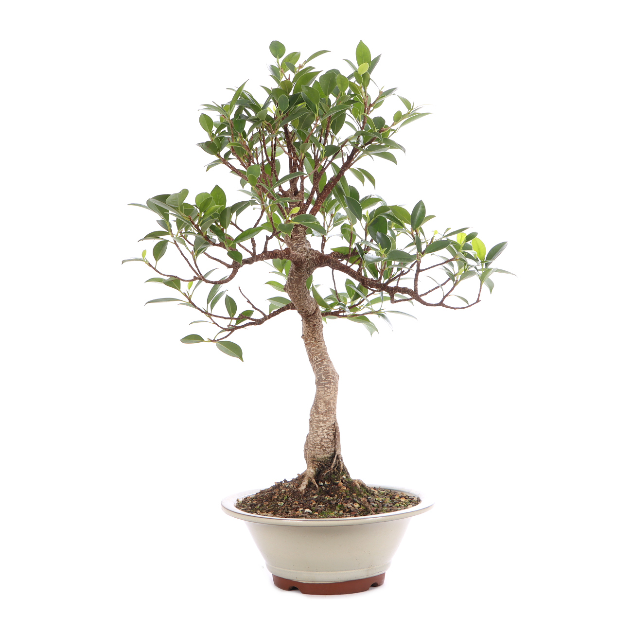 Die Sorte ‘Tiger Bark‘ hat im Vergleich zu der Art eine auffällige, tigerähnliche Rindenzeichnung. Diese weißen Kork- oder Lentizellen sowie die zahlreichen hellbraunen Luftwurzeln verleihen auch jungen Pflanzen schnell ein urwüchsiges Aussehen. Außerdem sind die Blätter dieser Ficus-Art klein und der Wuchs ist kompakt. Insgesamt hat diese Pflanze also sehr gute Eigenschaften als Bonsai.