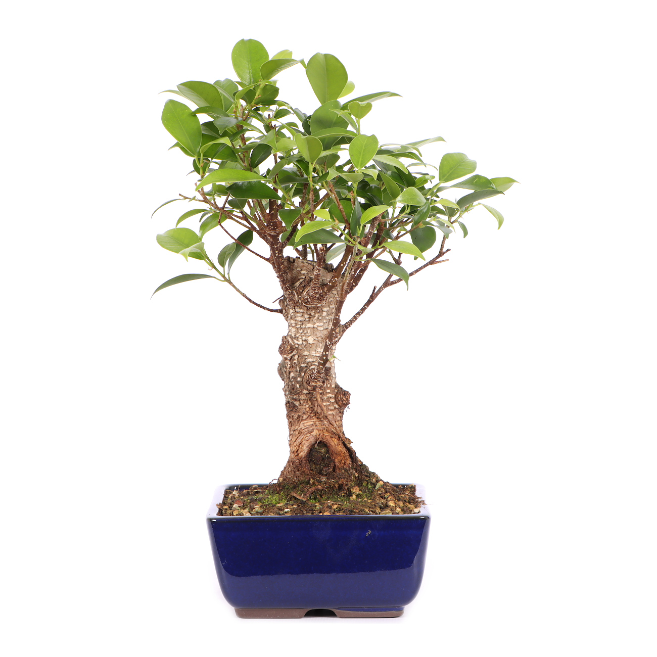 Die Sorte ‘Tiger Bark‘ hat im Vergleich zu der Art eine auffällige, tigerähnliche Rindenzeichnung. Diese weißen Kork- oder Lentizellen sowie die zahlreichen hellbraunen Luftwurzeln verleihen auch jungen Pflanzen schnell ein urwüchsiges Aussehen. Außerdem sind die Blätter dieser Ficus-Art klein und der Wuchs ist kompakt. Insgesamt hat diese Pflanze also sehr gute Eigenschaften als Bonsai.