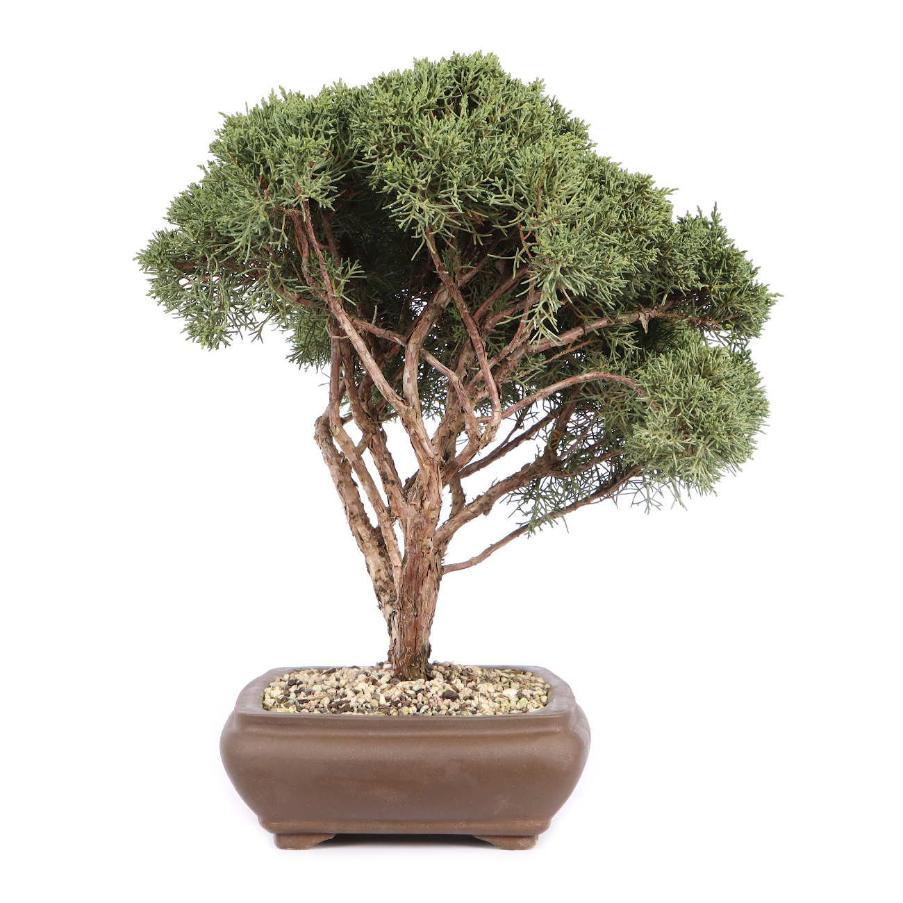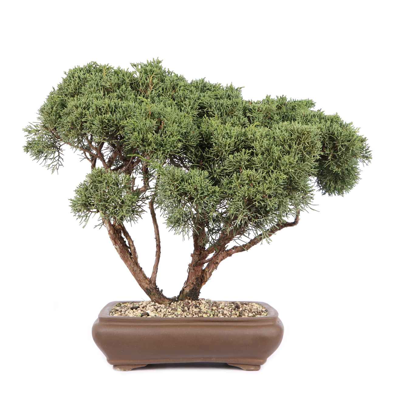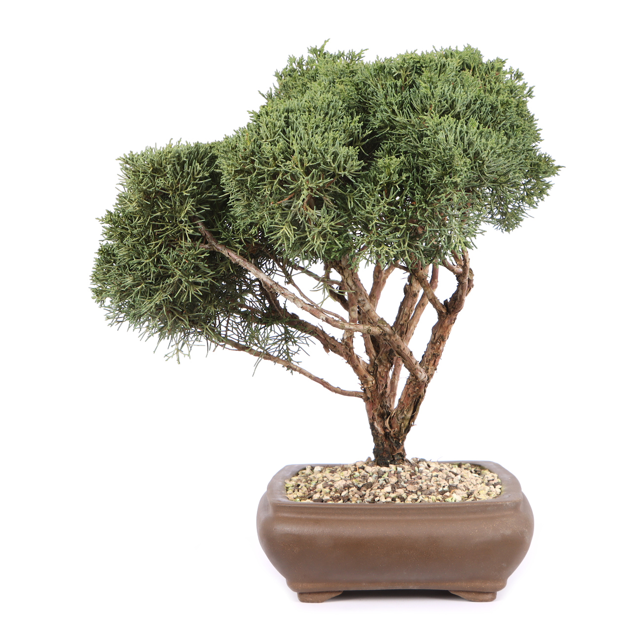 Der Chinesische Wacholder ist neben der Mädchenkiefer das bekannteste und beliebteste Nadelgehölz für die Bonsaigestaltung. Das feine immergrüne Laub, die Biegsamkeit des Holzes und die allgemeine Robustheit, machen die Pflanzen zu einem optimalen Ausgangsmaterial für die Bonsaigestaltung. In Japan findet man außerdem uralte und bizarr gewachsene Wacholder in der Natur. Durch die genannten Eigenschaften bieten sich fast unbegrenzte Möglichkeiten, das Grün der Pflanze neu anzuordnen und interessante Totholzpartien zu gestalten. Der Wacholder verzeiht hier auch massive Eingriffe, solange man ihm immer wieder Zeit zur Regeneration gibt. Ein sonniger Platz im Freien ist im Sommer für eine gesunde Entwicklung sehr wichtig. Bei einem schattigen Standort leidet die Ausfärbung der Nadeln, und die Triebe werden lang und unansehnlich. Auch im Winter ist ein sehr heller aber geschützter Platz unerlässlich. Die rötlich-braune Verfärbung der Nadeln im Winter ist normal. Im Frühjahr, wenn es wärmer wird, werden die Nadeln wieder grün. Auch wenn in den Sommermonaten reichliches Gießen erforderlich ist, muss Staunässe unbedingt vermieden werden. Kurzfristige Trockenheit verträgt der Chinesische Wacholder ohne Schaden. Die Gestaltung mit Formschnitt und Drahten wird in der Wachstumsruhe von November bis März vorgenommen. Umgetopft wird von August bis September in gut luft- und wasserdurchlässige Erde. An tierischen Schädlingen sind bei uns an Wacholdern nur Blattläuse und Spinnmilben aufgetreten. Mit handelsüblichen Pflanzenschutzmitteln sind diese aber schnell zu beseitigen. Ein optimaler Standort, aufmerksame Pflege und eine ausreichende Ernährung sind in der Regel die besten vorbeugenden Pflanzenschutzmaßnahmen.