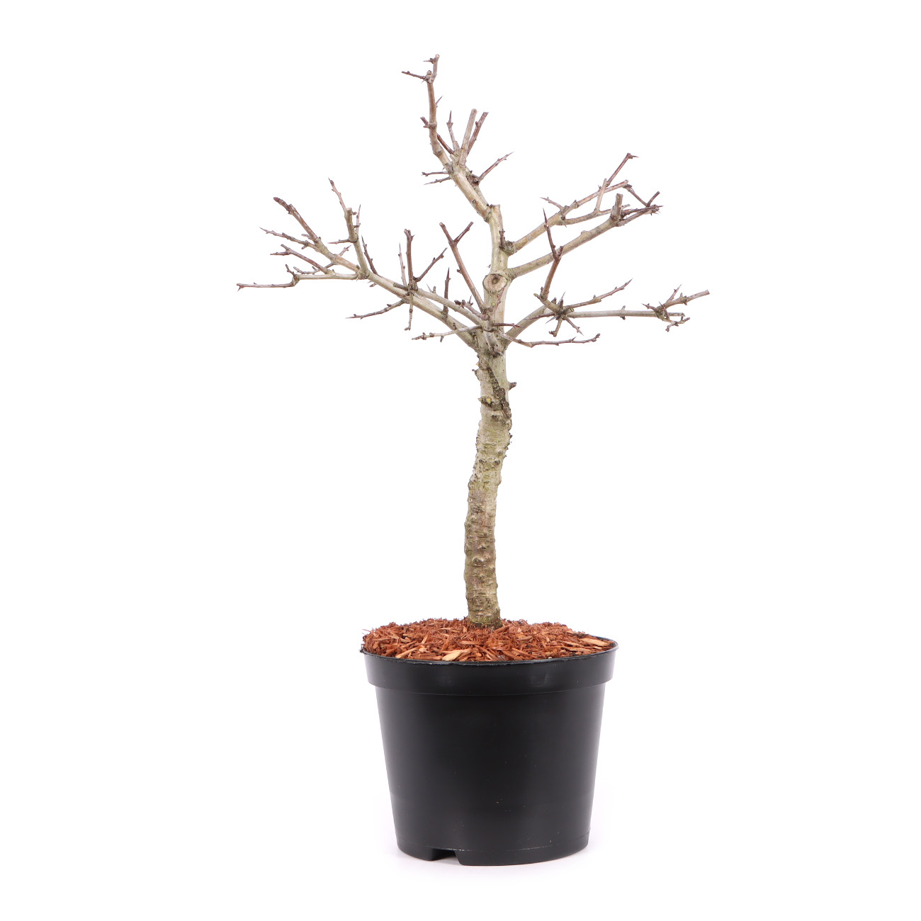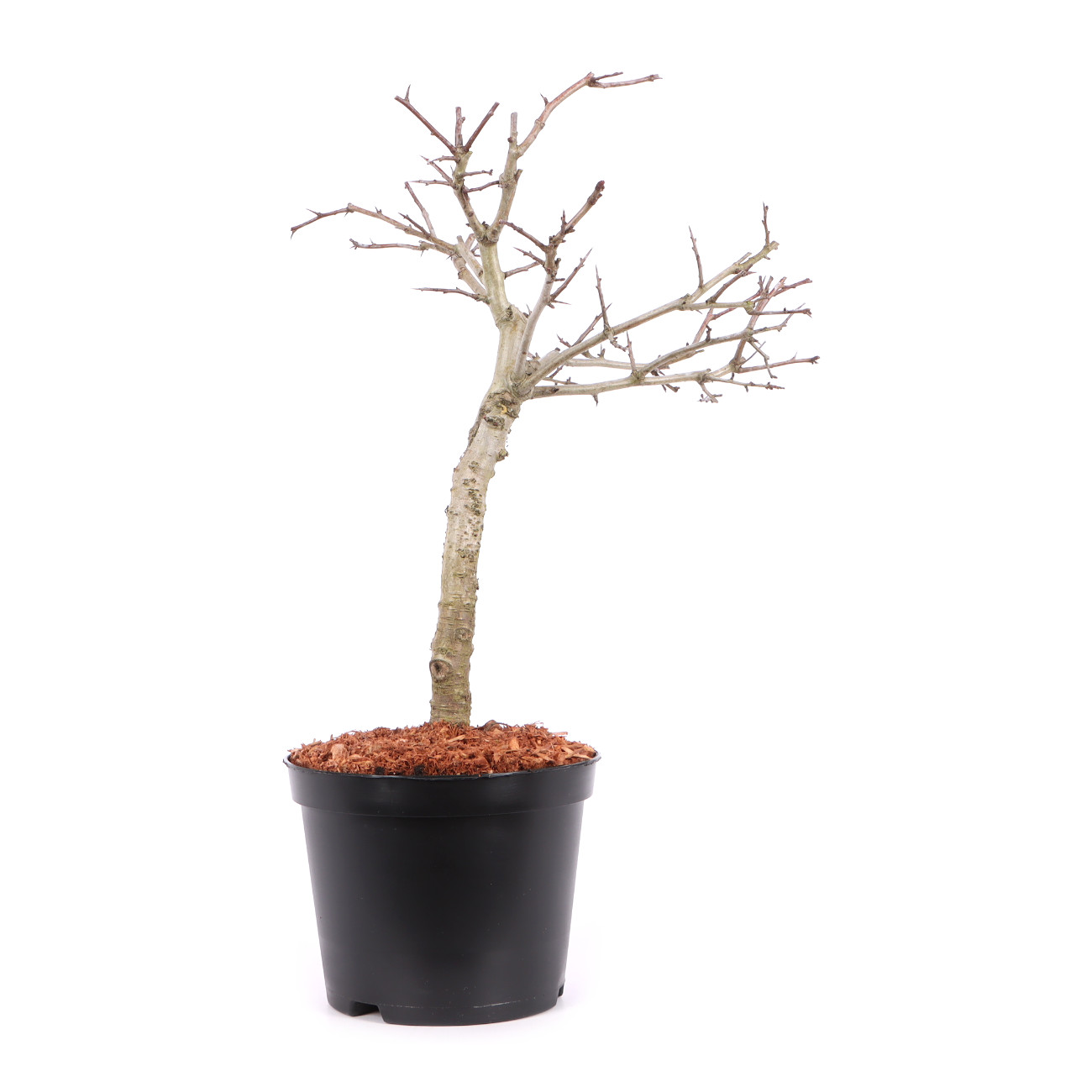 Die Sorte ‘Paul’s Scarlet‘ ist eigentlich ein Hybrid aus den heimischen Arten Crataegus monogyna und Crataegus laevigata. Es handelt sich bei den Pflanzen also meistens um Veredelungen. An jungen Pflanzen wachsen unterhalb der Veredelungsstelle manchmal noch die Äste der Unterlage. Diese müssen entsprechend entfernt werden. Der entscheidende Unterschied zu den Arten ist natürlich die Blüte des Rotdorns. Diese ist nämlich leuchtend, karmesinrot und gefüllt, also mit vielen Blütenblättern. Dies ist an einem Bonsai natürlich sehr dekorativ.