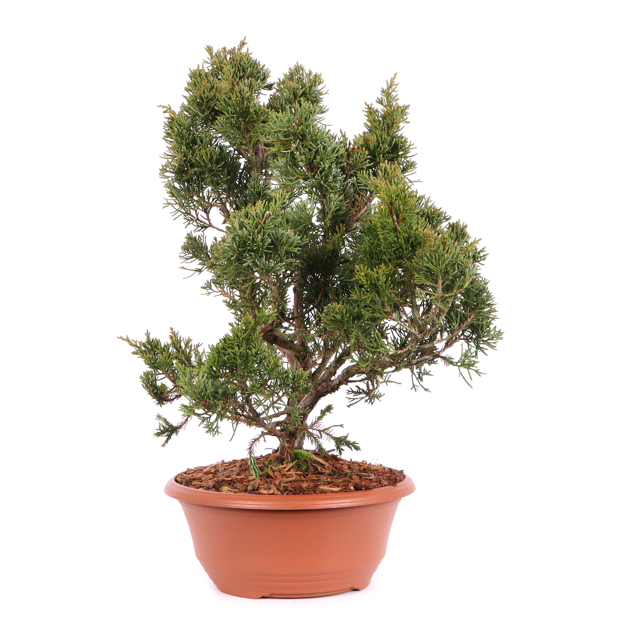 Der Chinesische Wacholder ist neben der Mädchenkiefer das bekannteste und beliebteste Nadelgehölz für die Bonsaigestaltung. Das feine immergrüne Laub, die Biegsamkeit des Holzes und die allgemeine Robustheit, machen die Pflanzen zu einem optimalen Ausgangsmaterial für die Bonsaigestaltung. In Japan findet man außerdem uralte und bizarr gewachsene Wacholder in der Natur. Durch die genannten Eigenschaften bieten sich fast unbegrenzte Möglichkeiten, das Grün der Pflanze neu anzuordnen und interessante Totholzpartien zu gestalten. Der Wacholder verzeiht hier auch massive Eingriffe, solange man ihm immer wieder Zeit zur Regeneration gibt. Ein sonniger Platz im Freien ist im Sommer für eine gesunde Entwicklung sehr wichtig. Bei einem schattigen Standort leidet die Ausfärbung der Nadeln, und die Triebe werden lang und unansehnlich. Auch im Winter ist ein sehr heller aber geschützter Platz unerlässlich. Die rötlich-braune Verfärbung der Nadeln im Winter ist normal. Im Frühjahr, wenn es wärmer wird, werden die Nadeln wieder grün. Auch wenn in den Sommermonaten reichliches Gießen erforderlich ist, muss Staunässe unbedingt vermieden werden. Kurzfristige Trockenheit verträgt der Chinesische Wacholder ohne Schaden. Die Gestaltung mit Formschnitt und Drahten wird in der Wachstumsruhe von November bis März vorgenommen. Umgetopft wird von August bis September in gut luft- und wasserdurchlässige Erde. An tierischen Schädlingen sind bei uns an Wacholdern nur Blattläuse und Spinnmilben aufgetreten. Mit handelsüblichen Pflanzenschutzmitteln sind diese aber schnell zu beseitigen. Ein optimaler Standort, aufmerksame Pflege und eine ausreichende Ernährung sind in der Regel die besten vorbeugenden Pflanzenschutzmaßnahmen.