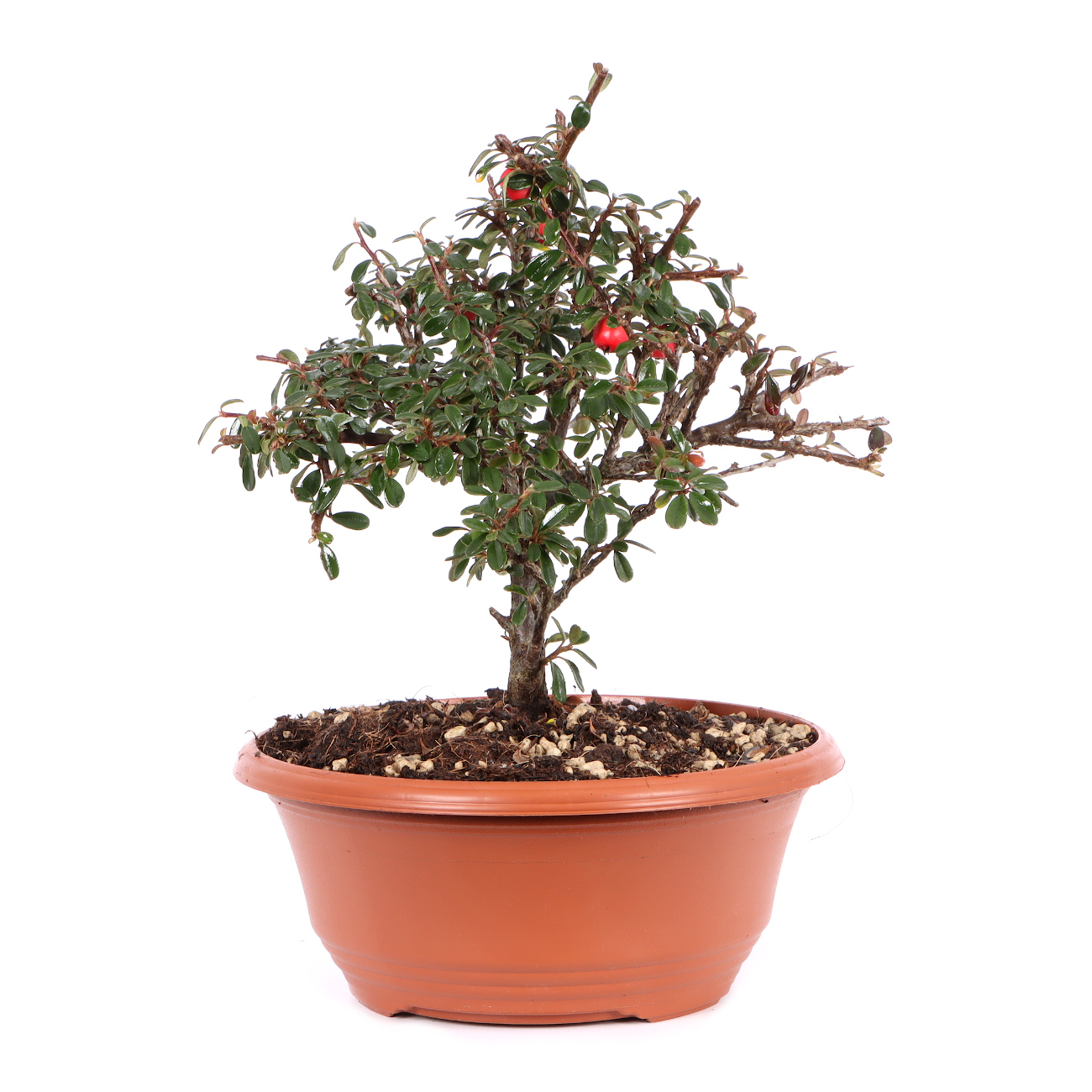 Die Zwergmispel ist wie für die Bonsaigestaltung geschaffen. Ihre Blätter, Blüten und Früchte sind klein, absolut schnittverträglich und treiben immer wieder willig aus. Sie blüht von Mai bis Juni mit kleinen weißen Blüten und bekommt anschließend ab September rote Beeren. Diese haften auch noch im Winter an der Pflanze. Sie ist für alle Gestaltungsformen geeignet, zumal sie das ganze Jahr gedrahtet und geschnitten werden kann. Sie kann über viele Jahre hin sehr klein gehalten werden. Die Zwergmispel eignet sich auch als Unterbepflanzung für Wälder oder Landschaften (Saikei). Beim Drahten sollte darauf geachtet werden, dass die kleinen Blätter nicht mit eingedrahtet werden. Dies ist bei der Vielzahl an Blättern natürlich nicht ganz einfach. Die Zwergmispel stellt keine besonderen Standortansprüche, jedoch sollte man Extreme vermeiden. Je heller der Standort ist, umso ausgeprägter ist die Blüten- und Fruchtbildung.