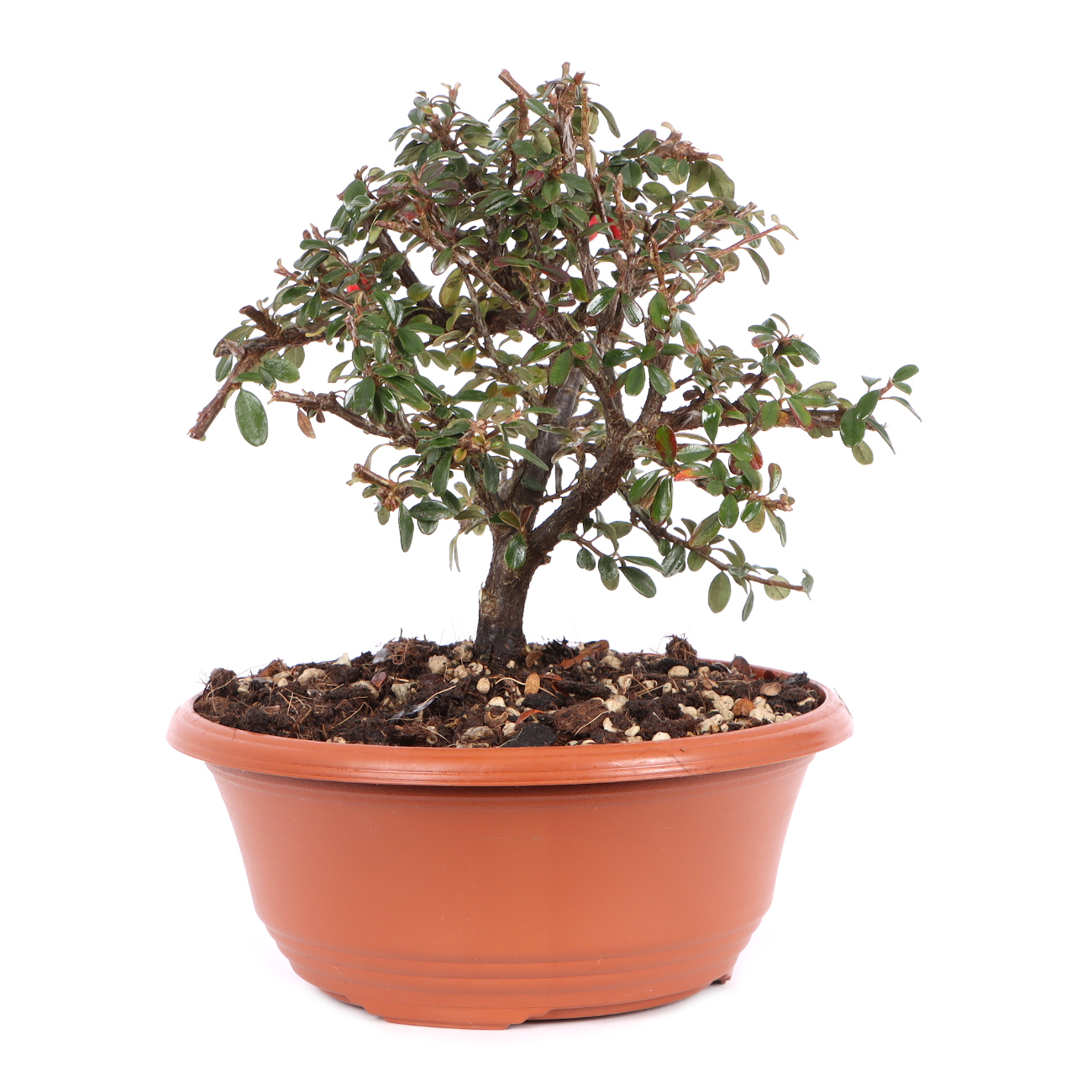 Die Zwergmispel ist wie für die Bonsaigestaltung geschaffen. Ihre Blätter, Blüten und Früchte sind klein, absolut schnittverträglich und treiben immer wieder willig aus. Sie blüht von Mai bis Juni mit kleinen weißen Blüten und bekommt anschließend ab September rote Beeren. Diese haften auch noch im Winter an der Pflanze. Sie ist für alle Gestaltungsformen geeignet, zumal sie das ganze Jahr gedrahtet und geschnitten werden kann. Sie kann über viele Jahre hin sehr klein gehalten werden. Die Zwergmispel eignet sich auch als Unterbepflanzung für Wälder oder Landschaften (Saikei). Beim Drahten sollte darauf geachtet werden, dass die kleinen Blätter nicht mit eingedrahtet werden. Dies ist bei der Vielzahl an Blättern natürlich nicht ganz einfach. Die Zwergmispel stellt keine besonderen Standortansprüche, jedoch sollte man Extreme vermeiden. Je heller der Standort ist, umso ausgeprägter ist die Blüten- und Fruchtbildung.