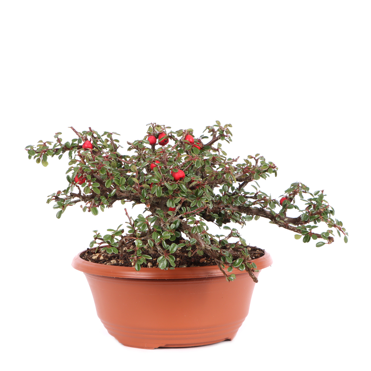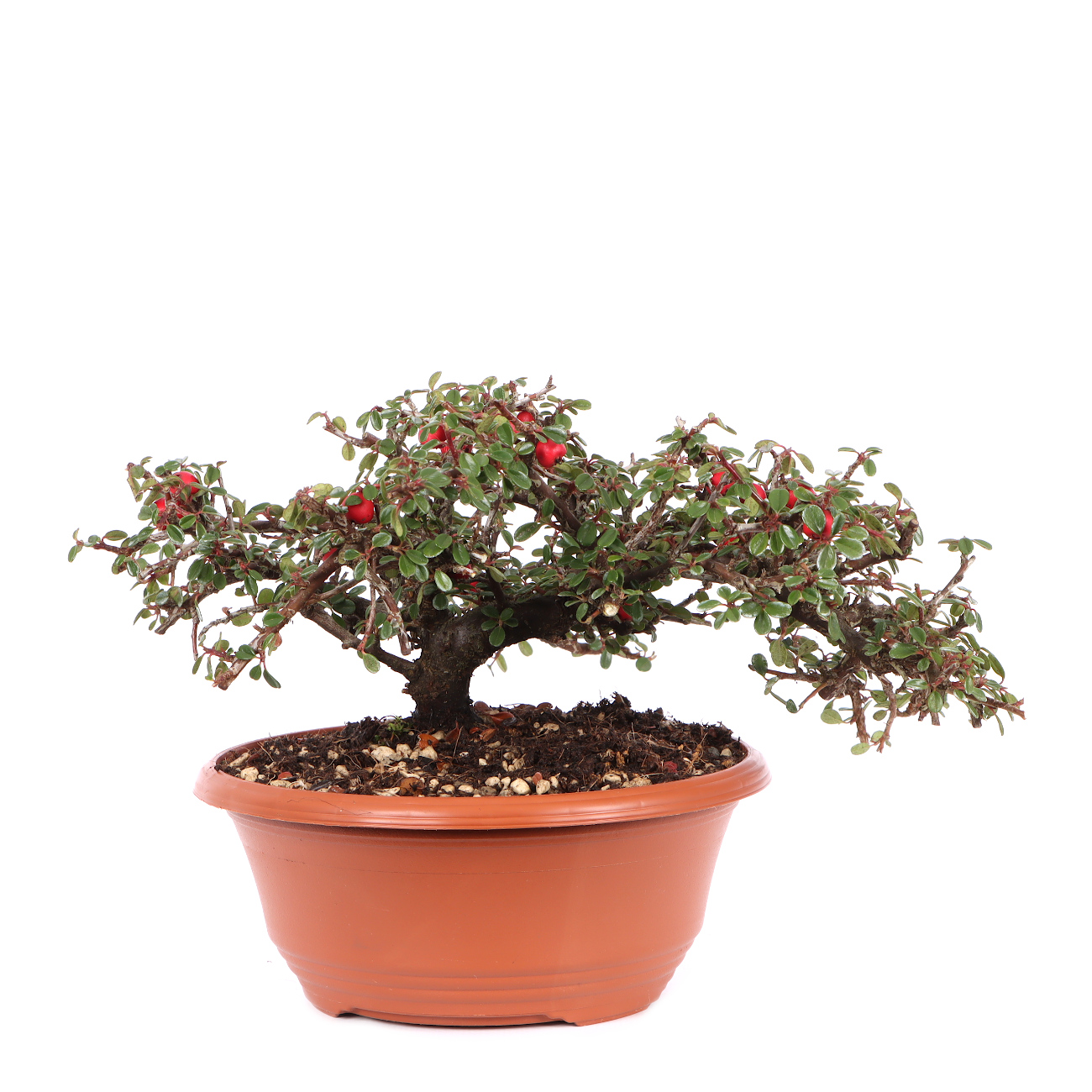 Die Zwergmispel ist wie für die Bonsaigestaltung geschaffen. Ihre Blätter, Blüten und Früchte sind klein, absolut schnittverträglich und treiben immer wieder willig aus. Sie blüht von Mai bis Juni mit kleinen weißen Blüten und bekommt anschließend ab September rote Beeren. Diese haften auch noch im Winter an der Pflanze. Sie ist für alle Gestaltungsformen geeignet, zumal sie das ganze Jahr gedrahtet und geschnitten werden können. Sie kann über viele Jahre hin sehr klein gehalten werden. Die Zwergmispel eignet sich auch als Unterbepflanzung für Wälder oder Landschaften (Saikei). Beim Drahten sollte darauf geachtet werden, dass die kleinen Blätter nicht mit eingedrahtet werden. Dies ist bei der Vielzahl an Blättern natürlich nicht ganz einfach. Die Zwergmispel stellt keine besonderen Standortansprüche, aber man sollte Extreme trotzdem vermeiden. Je heller der Standort ist, umso ausgeprägter ist die Blüten- und Fruchtbildung.