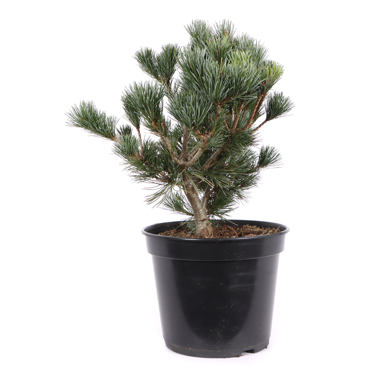 Die Mädchenkiefer hat in Japan aufgrund ihrer Symbolik (Männlichkeit, Stärke, langes Leben) einen sehr hohen Stellenwert und ist vielleicht der beliebteste Bonsai überhaupt. Sie ist robust und bietet viele gestalterische Möglichkeiten. Als Bonsai strahlen sie durch ihren derben Charakter viel Kraft aus. Andererseits zeigt die gestaltete Kiefer im Vergleich zu Laubbäumen wenig Veränderung und vermittelt dem Betrachter dadurch im Jahresverlauf viel Ruhe. Eine gestaltete Kiefer ist im Grunde sehr pflegeleicht. Die neuen Triebe (Kerzen) werden im Mai eingekürzt bzw. mit den Fingern gebrochen und zu dichte Astpartien werden im Spätsommer ausgelichtet. Im Sommer ist ein sonniger Standort sehr von Vorteil. Kiefern sollten nicht zu nass gehalten werden. Bei langen Regenperioden empfiehlt es sich die Pflanze sogar unter ein Dach zu stellen. Drahten und Gestalten kann man das ganze Jahr über. Dies sollte aber nicht mit dem Umtopfen Anfang September zusammen fallen. Außerdem muss die Pflanze nach der Gestaltung am besten frostfrei stehen. Bei dem Substrat verwendet man eine strukturstabile, luftige Mischung und achtet auf das Vorhandensein von Mykorrhiza-Pilzen. Man erkennt den Pilz an einem gleichmäßigen, feinen und weißen Belag, der die Wurzeln umhüllt und im Optimalfall die ganze Erde durchzieht. Kiefern sind sehr frosthart. Trotzdem sollten sie im Winter vor trockenen Winden geschützt werden. Bonsai-Sämlinge von der Mädchenkiefer haben sich in Mitteleuropa nicht bewährt bzw. gehen nach gewisser Zeit meistens ein. Wir bieten ausschließlich Veredelungen an, da die Wurzeln der Unterlage (z.B. Pinus thunbergii) besser an unser Klima angepasst sind.