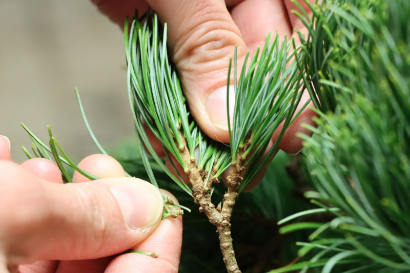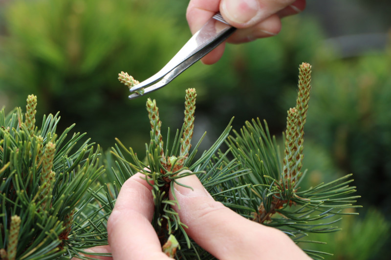 Neben dem Pinzieren im Frühjahr, ist das Auslichten und Ausdünnen der Pflanze die entscheidende Pflegemaßnahme, um eine kompakte und dicht verzweigte Kiefer zu entwickeln. Die Bedeutung dieser Pflegemaßnahmen ist nicht zu unterschätzen, da besonders eine Mädchenkiefer nur sehr selten neue Knospen im Inneren bildet. Wenn die Pflanze also erstmal verkahlt ist, kann man das Grün nur noch durch das Drahten und Biegen der Äste zurückführen. Das Ergebnis ist aber meistens weniger befriedigend.