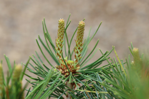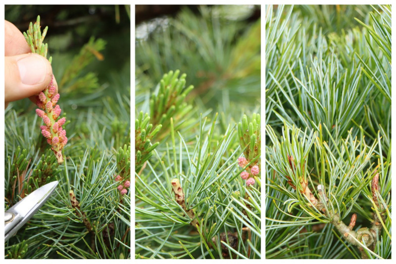 Vereinzelt bildet die Kiefer im unteren Bereich der Kerze auffällige Blütenknospen. Diese männlichen Blüten sind an einem Bonsai ehr unerwünscht, da sie im weiteren Verlauf abfallen und einen kahlen Triebabschnitt ohne Nadeln hinterlassen. Aus diesem Grund werden derartige Trieb kurz über der Basis abgeschnitten, um einen Neuaustrieb ohne Blüten zu bekommen.