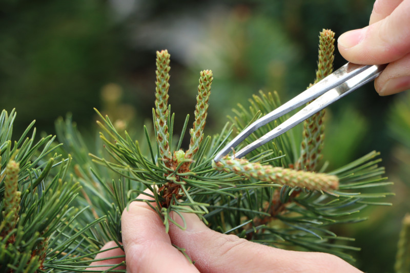 Im Sommer entwickeln sich die neuen Triebe der Kiefer teilweise recht unterschiedlich. Häufig entsteht am Triebende ein langer, kräftiger und dichter Trieb. Wenn man hier nicht das Wachstum bremst und die Pflanze auslichtet, wird sie aus der Form wachsen und innen verkahlen.