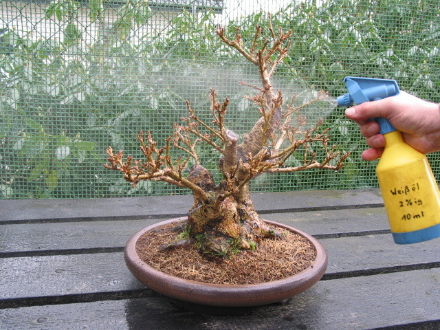 Alte Blätter und Nadeln sind ebenfalls zu entfernen. Anschließend sollte die Pflanze gründlich gereinigt werden. Dazu kann man eine Bürste verwenden um grobe Verunreinigungen und Moos zu entfernen. Die Bürste sollte dabei jedoch nicht die Rinde verletzen. Am besten eignet sich hier also eine Kunststoff- oder Messingbürsten. Wir empfehlen die Verwendung eines Hochdruckreinigers für eine schnelle und effiziente Pflanzenreinigung. Dabei muss man jedoch darauf achten, dass mit wenig Wasserdruck gearbeitet wird damit nur der Moos-, Flechten- und Algenbewuchs entfernt und nicht die Rinde beschädigt wird.