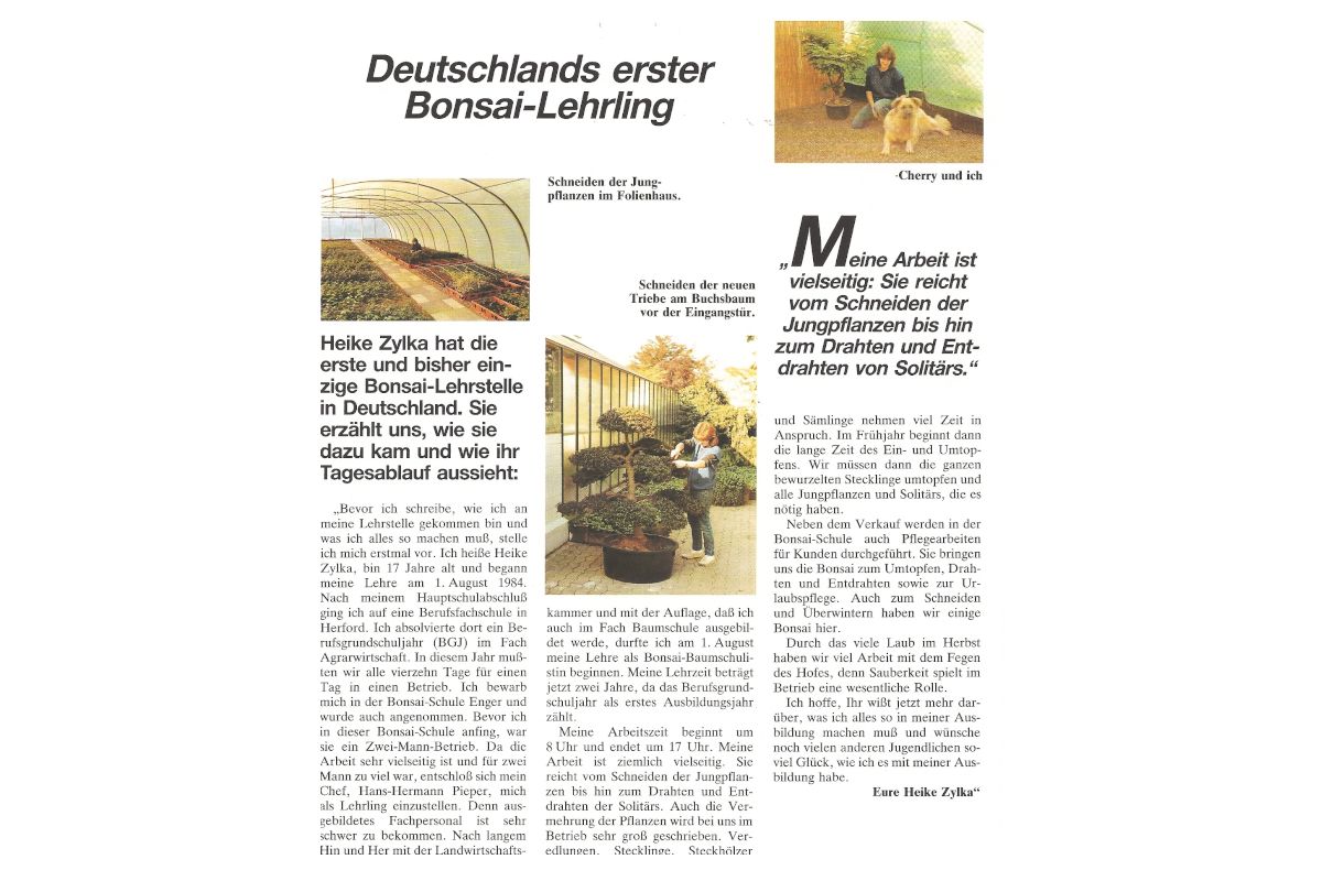 Bereits seit 1984 ist die Bonsaischule Enger ein anerkannter Ausbildungsbetrieb für Gärtner (Baumschule) und Heike Zylka war Deutschlands erster Bonsai-Lehrling und die erste Mitarbeiterin in dem Betrieb.