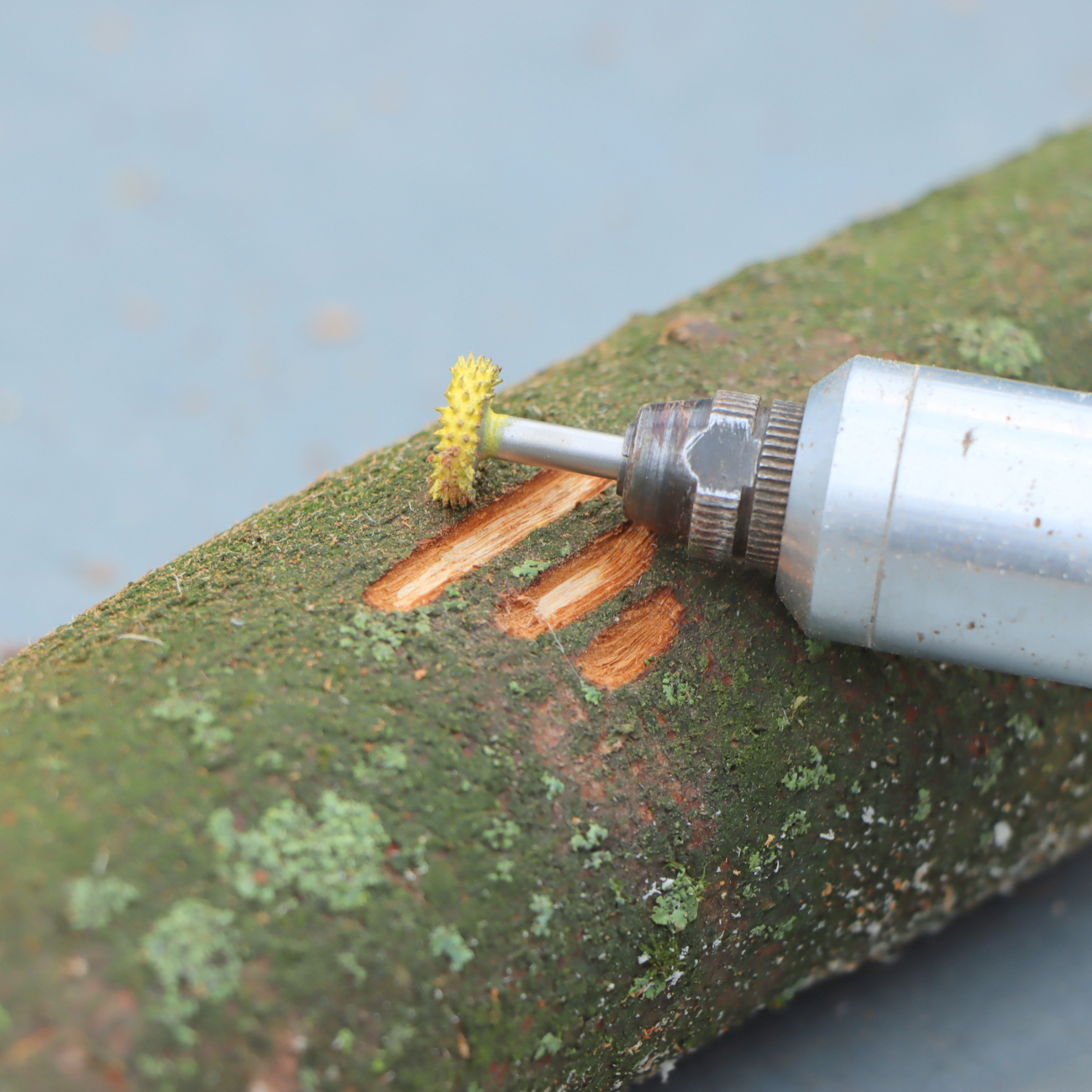 Die hochwertigen Fräser von Saburrtooth (USA) haben langlebige Hartmetall-Schneidzähne für eine effektive Holzbearbeitung. Daneben eignet sich der Fräskopf auch sehr gut für das Entfernen von Rinde. Wir empfehlen die Verwendung eines Geradschleifers oder einer Biegewelle. Es kann aber auch eine Bohrmaschine verwendet werden.