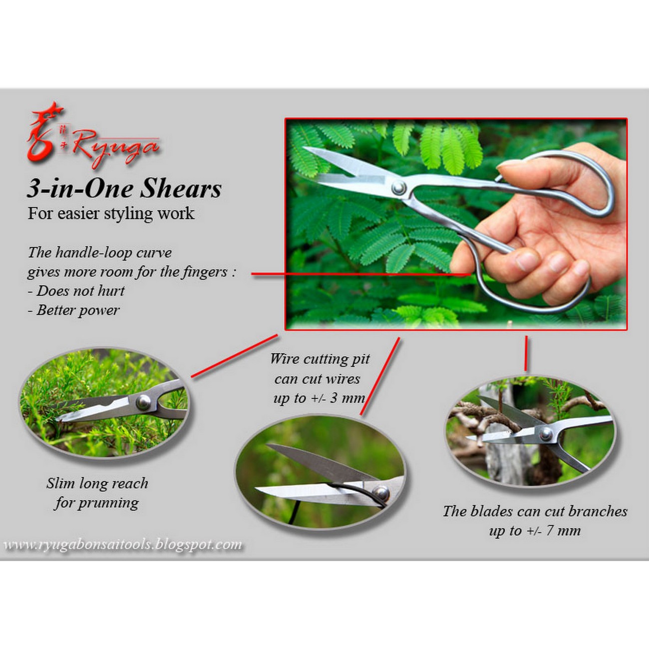 Die Ryuga „3 in 1 Schere“ ermöglicht neben dem einfachen Rückschnitt auch das Schneiden von dickeren Ästen oder sogar Draht. Dadurch erspart man sich bei der Arbeit an bestimmten Pflanzen den Wechsel des Werkzeuges. Beispielsweise bei dem Überarbeiten von Pre-Bonsai eignet sich dieses Werkzeug sehr gut. Hier müssen nämlich durchaus gleichzeitig dünne und dickere Triebe sowie Draht geschnitten werden.