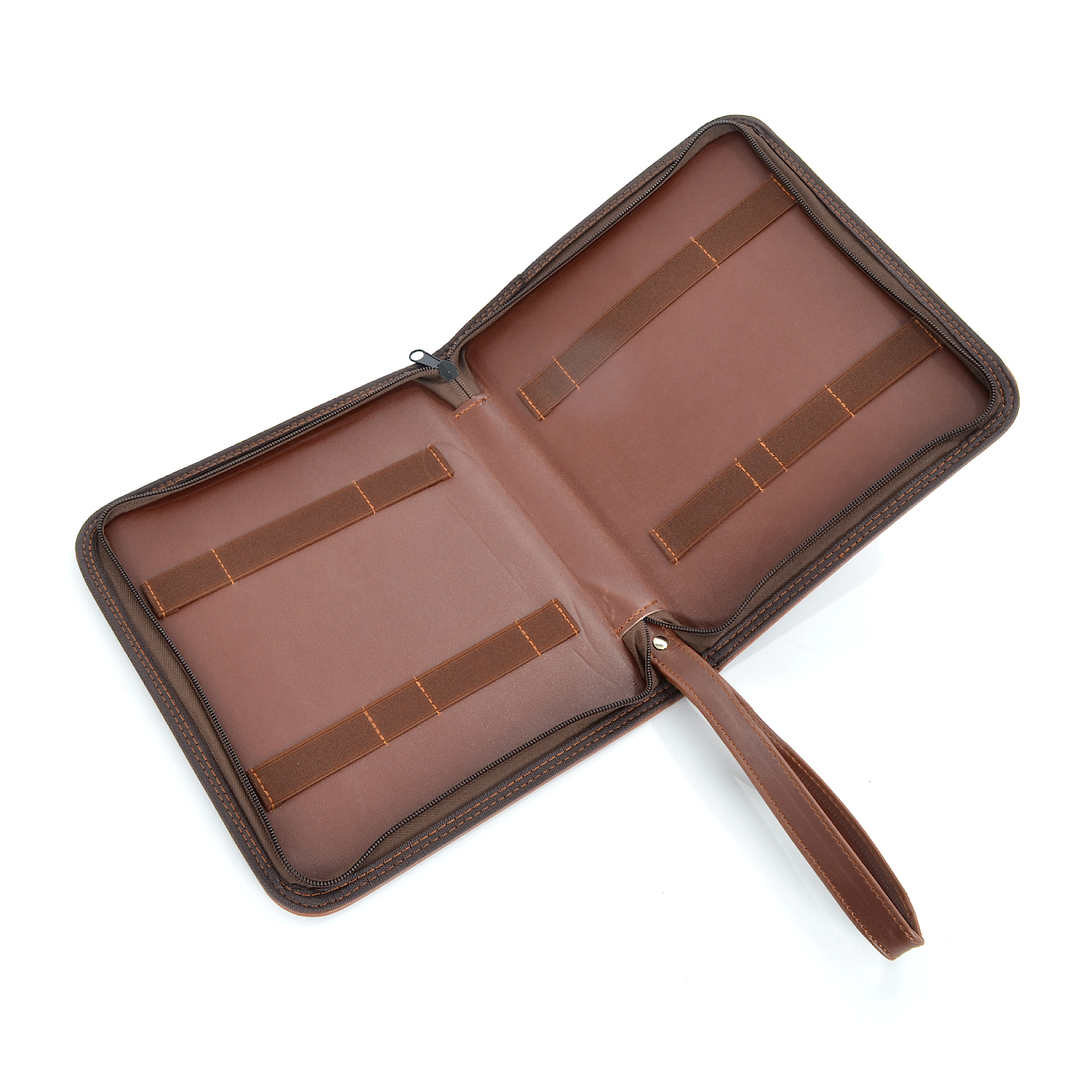 Die aus braunem Kunstleder hergestellte Werkzeugtasche aus China der Marke Ryuga bietet Platz für sechs Bonsai-Werkzeuge. Man kann sie zusammenklappen und mit einem Reißverschluss verschließen. So bleibt das Werkzeug immer zusammen und es geht nichts verloren.