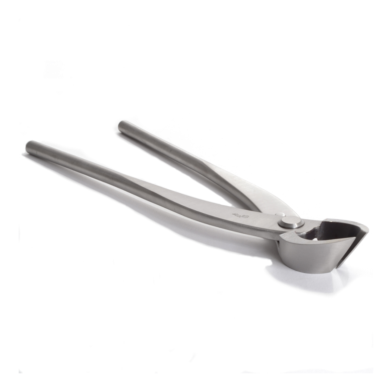 Die Konkavzange ist neben der Stutzschere vielleicht das wichtigste Werkzeug für eine erfolgreiche Bonsaipflege. Das Besondere an dieser Zange ist ihre spezielle Form, die es erlaubt Äste direkt am Ansatz und damit bündig zum Stammverlauf abzuschneiden. Dadurch kann die Wunde gut verheilen und es entstehen hier keine unschönen Verdickungen. Optimaler Weise wird nach dem bündigen Schnitt mit der Konkavzange außerdem eine Hohlzange oder ein anderes Werkzeug zum leichten aushöhlen der Wunde eingesetzt. Besonders bei Ahornen, Buchen und anderen glattrindigen Arten stellt man so eine makellose Verwachsung am Stamm sicher. Im Unterschied zu einer einfachen Zange greifen die Klingen der Konkavzange im geschlossenen Zustand außerdem übereinander. Dies ist ein besonderes Qualitätsmerkmal dieses Werkzeuges und es Bedarf viel Erfahrung für die Herstellung. Dadurch ist der Schnitt der Zangen aber vergleichbar mit dem einer Schere und entsprechend sauber. Außerdem sind die Klingen durch die Anordnung länger scharf und insgesamt haltbarer. Bei der Wahl der Zange muss man berücksichtigen, dass die halbe Klingenlänge in etwa den maximalen Durchmesser des zu schneidenden Astes vorgibt. Wenn die Klinge also beispielsweise eine Länge von 25 mm hat, so sollte der zu schneidende Ast nicht stärker als 12 mm sein. Je nach Holzart kann es hier aber zu Abweichungen kommen!