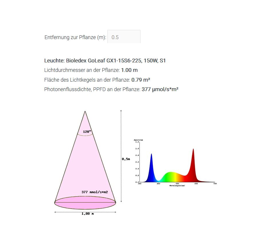 PPFD bei Abstand 50cm: 377µmol/s·m² (auf einer Fläche von 100 x 100 cm)