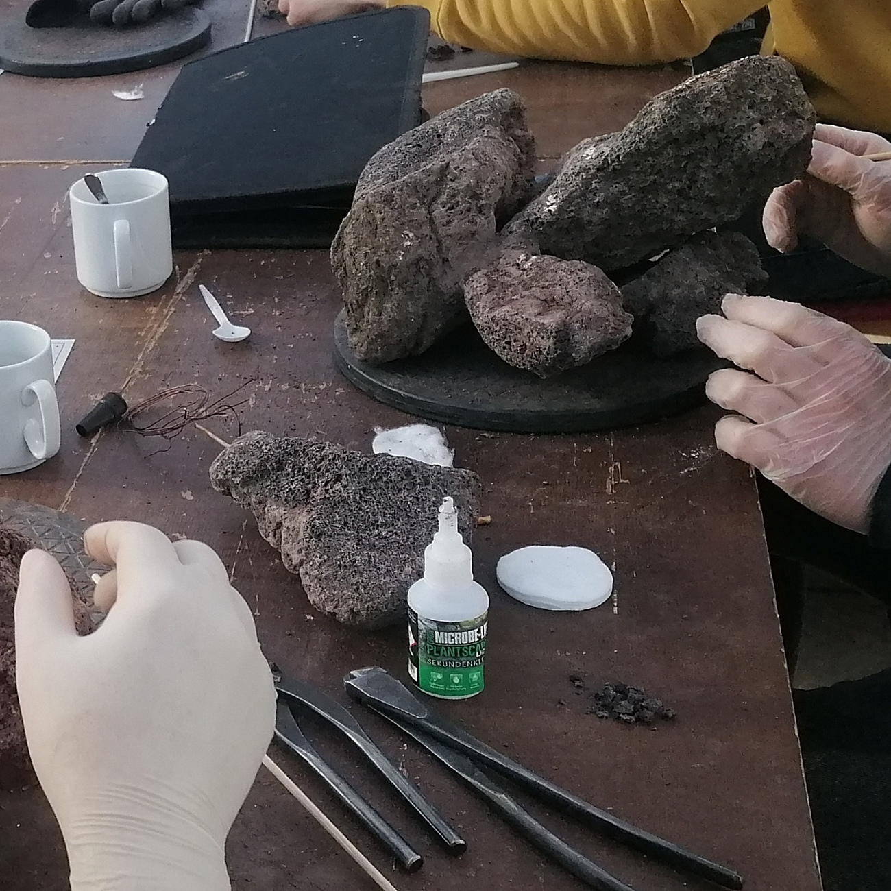 *Die Wattemethode wurde von Aquascapern aus Indonesien entwickelt. Hierbei befindet sich zwischen den zu verklebenden Gegenständen etwas Watte, die mit dem flüssigen Kleber beträufelt wird. Der Zellstoff nimmt den Klebstoff schnell und kapillar auf und durch den vorhandenen Sauerstoff in der Struktur kommt es zu einer schnellen Reaktion. Bei der Aushärtung entsteht Wärme und es entsteht teilweise sogar Rauch. Die Kontaktstelle kann im Anschluss noch mit Gesteinsmehl o.ä. bestreut werden, um den Übergang optisch unsichtbar zu machen und zusätzlich zu stabilisieren.