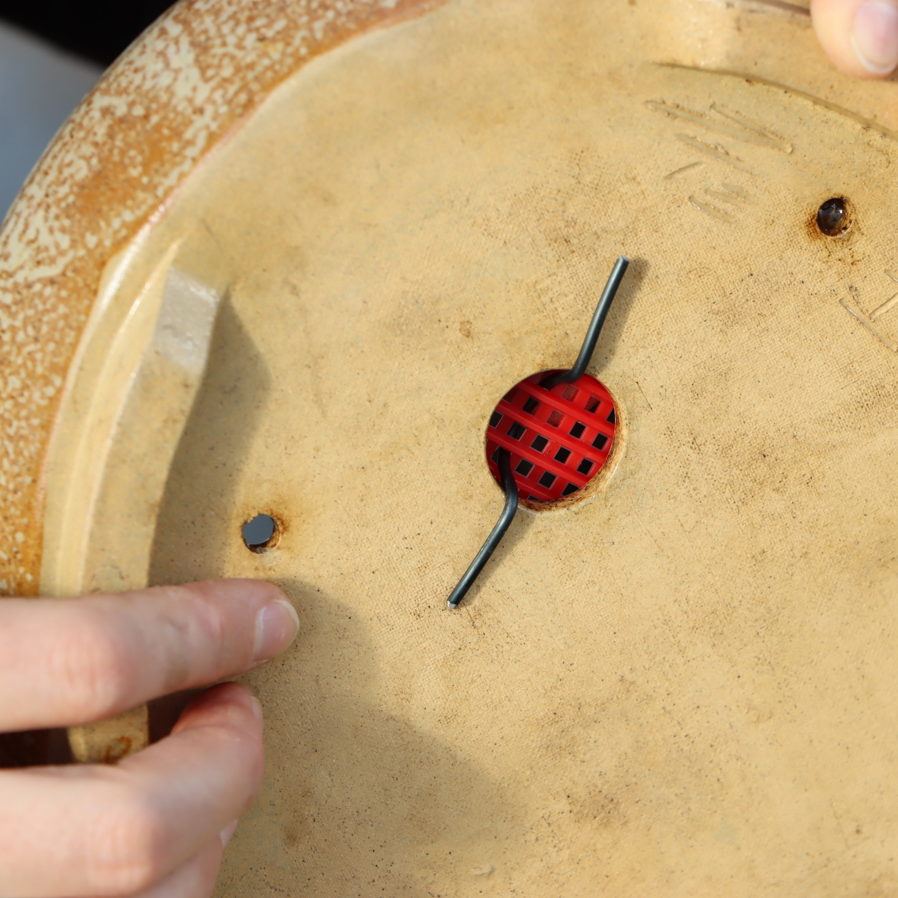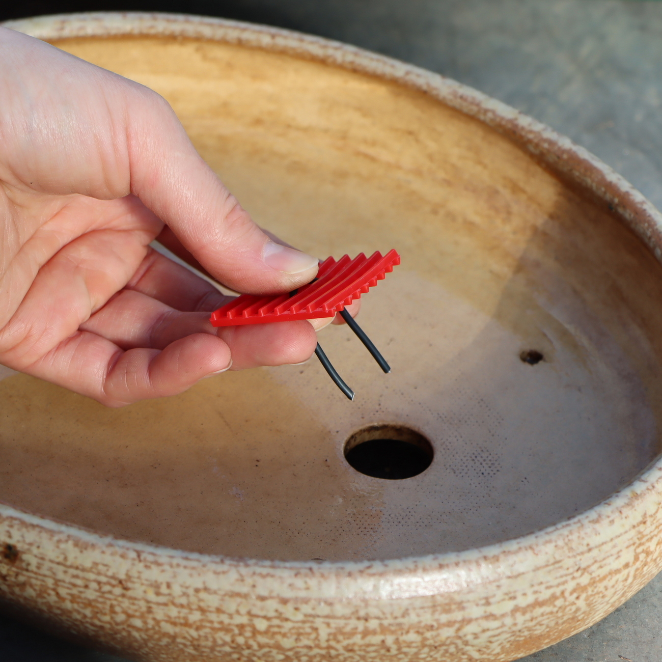 Die Abzugslöcher von Keramikschalen müssen mit einem Netz bedeckt werden, damit die Erde nicht ausgespült wird. Durch die Verwendung von farbigen Netzen behält man außerdem den Überblick, wann die Pflanze umgetopft wurde.