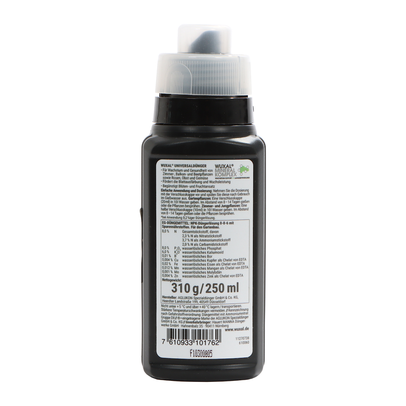 WUXAL Universaldünger ist ein mineralischer Flüssigdünger, der sowohl über das Blatt, als auch über die Wurzeln aufgenommen wird. Alle notwendigen Hauptnährstoffe und Spurenelemente sind in einer für Bonsai sehr guten Konzentration enthalten.