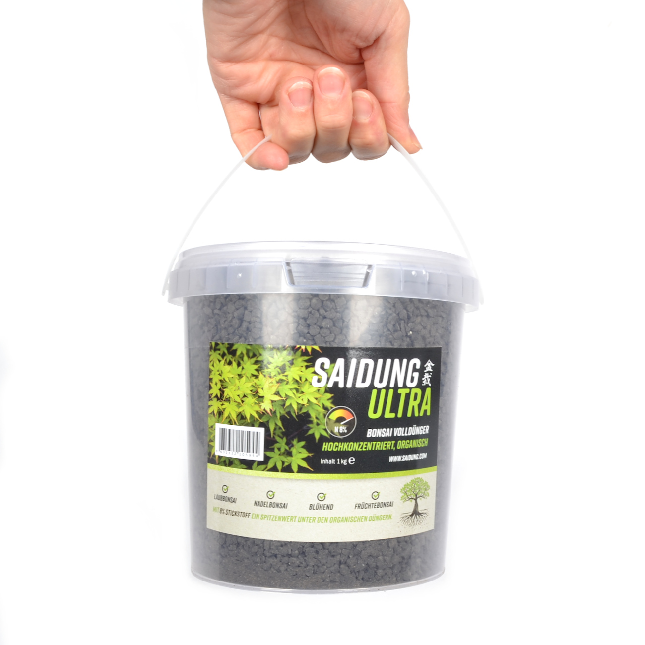 Saidung Ultra ist ein hochkonzentrierter organischer Volldünger, geeignet für alle Freiland-Bonsai. Nur wenige Dünger dieser Kategorie erreichen einen so hohen Wert an Stickstoff. Auch Phosphor und Kalium sind auf den Bedarf von Bonsai zugeschnitten. Zudem erhält Saidung essentielle Spurennährstoffe, wie Calcium, Magnesium und Schwefel. Saidung besteht aus pflanzlichen Rohstoffen und enthält im Gegensatz zu vielen anderen organischen Volldüngern keine Tierexkremente.