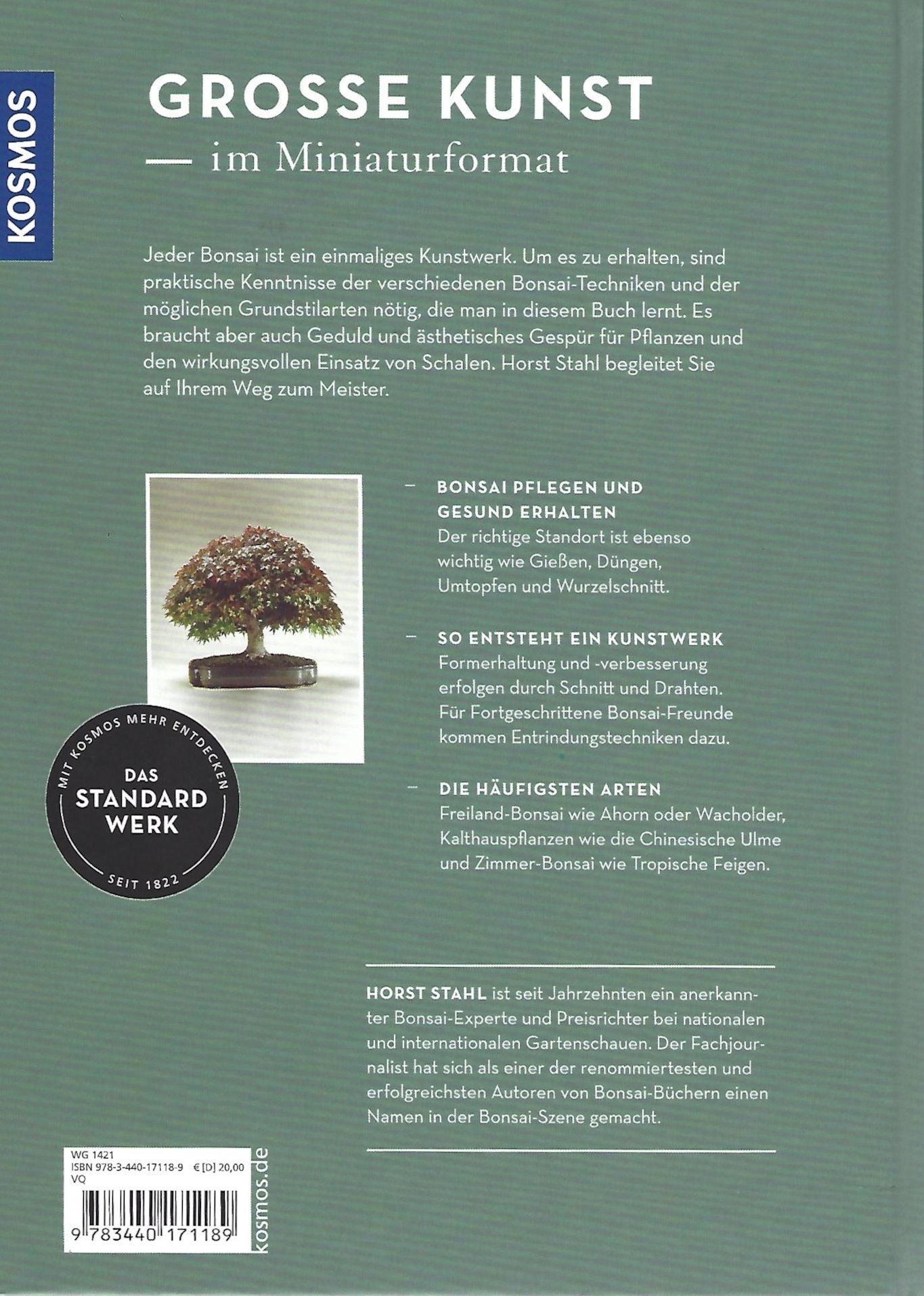 Horst Stahl, einer der renommiertesten Bonsai-Experten, vermittelt in diesem Band Know How und Philosophie gleichermaßen. Im Grundkurs lernen Sie die wichtigsten Bonsai-Arten, deren Formschnitt und tägliche Pflege kennen. Umfangreiches Wissen und seine praktische Umsetzung zu Grundstil- und Gestaltungsprinzipien sowie den wirkungsvollen Einsatz von Schalen und Gefäßen, macht Sie im zweiten Teil des Buches zum Bonsai-Meister.