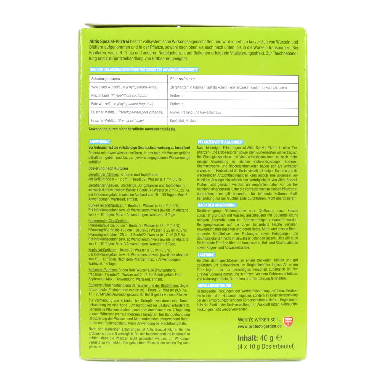 Alitis-Spezial-Pilzfrei ist ein wasserdispergierbares Granulat und kann als Gieß- beziehungsweise Spritzmittel gegen Wurzelfäule und Welkepilze (Phytophthora-Arten) sowie Falsche Mehltaupilze an verschiedenen Zier- und Nutzpflanzen eingesetzt werden.