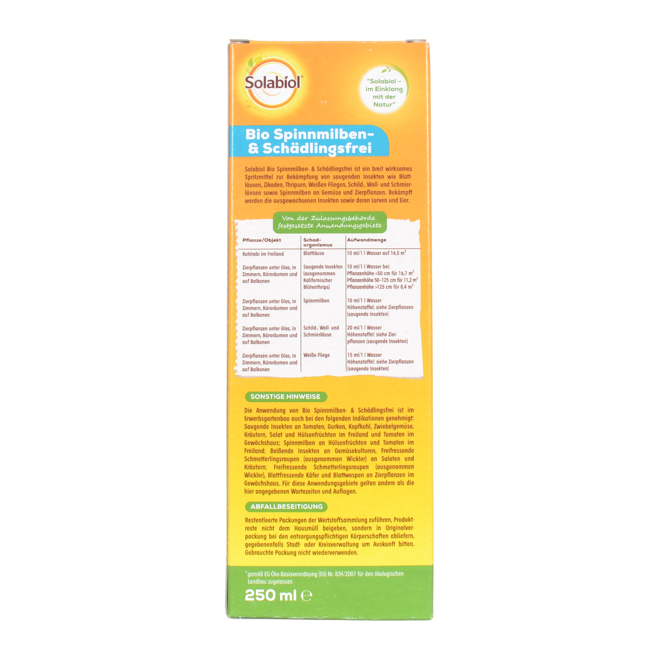 Solabiol Bio Spinnmilben- & Schädlingsfrei ist ein breit wirksames Spritzmittel zur Bekämpfung von saugenden Insekten wie Blattläusen, Zikaden, Thripsen, Weißen Fliegen, Schild-, Woll-, und Schmierläusen sowie Spinnmilben an Gemüse und Zierpflanzen. Bekämpft werden die ausgewachsenen Insekten sowie deren Larven und Eier.