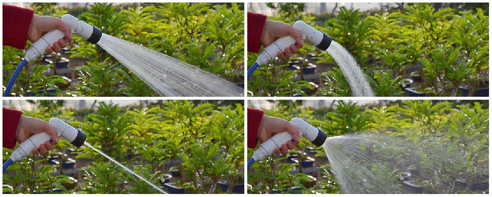 Der Wasserstrahl der Kompakt-Brause lässt sich durch Drehen an der Brause stufenlos verstellen (4 Strahlformen, s. Fotos). So kann man neben gezielten Gießarbeiten auch größere Flächen Bewässern und Reinigen.